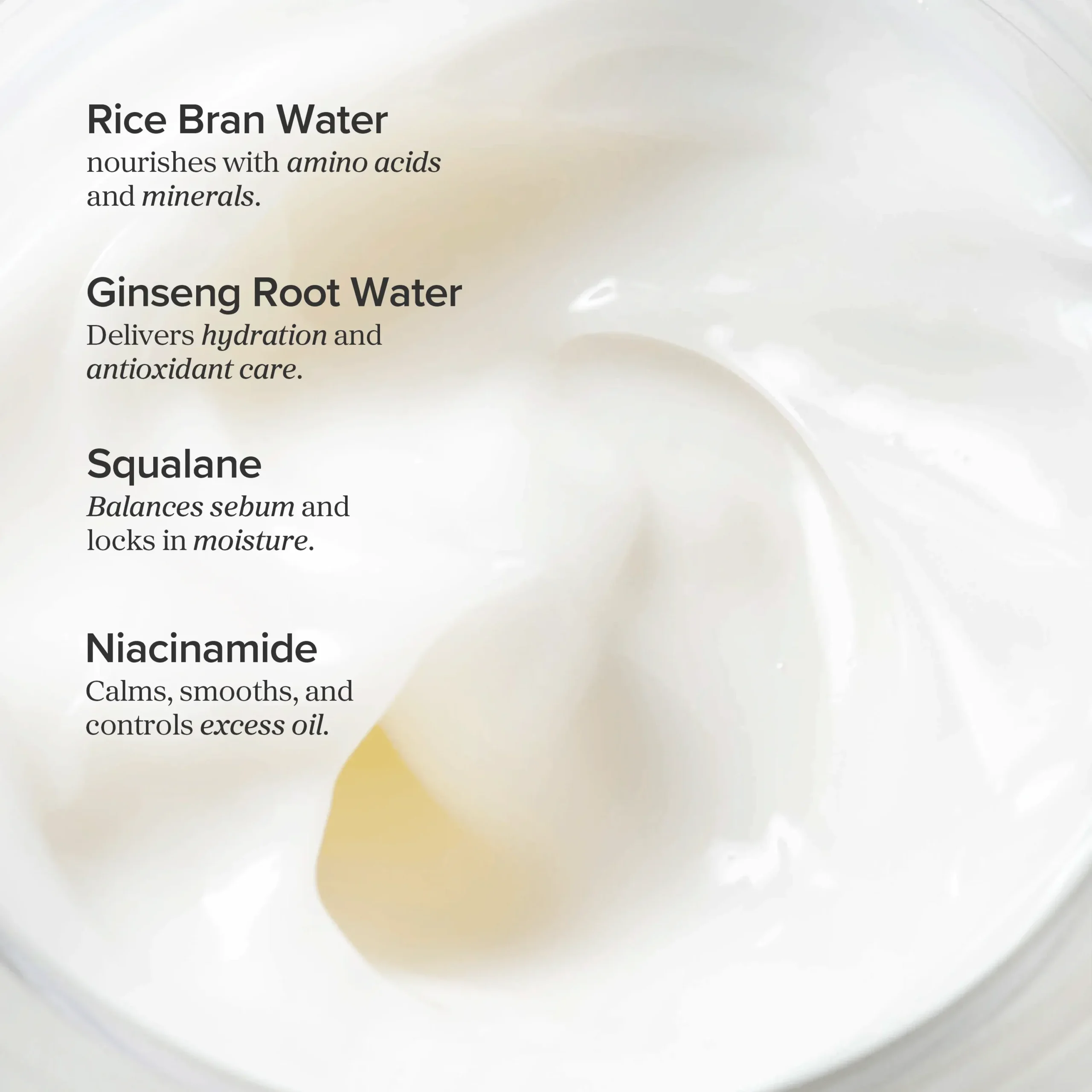 AQUA, GLYCERIN, HYDROGENATED POLYDECENE, 1,2-HEXANEDIOL, NIACINAMIDE, SQUALANE, BUTYLENE GLYCOL, PROPANEDIOL, BUTYLENE GLYCOL DICAPRYLATE/DICAPRATE, CETEARYL OLIVATE, SORBITAN OLIVATE, AMMONIUM ACRYLOYLDIMETHYLTAURATE/VP COPOLYMER, XANTHAN GUM, PANAX GINSENG ROOT WATER, ACRYLATES/C10-30 ALKYL ACRYLATE CROSSPOLYMER, TROMETHAMINE, CARTHAMUS TINCTORIUS (SAFFLOWER) SEED OIL, HYDROGENATED COCONUT OIL, GLYCERYL ACRYLATE/ACRYLIC ACID COPOLYMER, ORYZA SATIVA (RICE) BRAN WATER, ETHYLHEXYLGLYCERIN, ADENOSINE, CAPRYLIC/CAPRIC TRIGLYCERIDE, DISODIUM EDTA, HYALURONIC ACID, HYDROLYZED HYALURONIC ACID, SODIUM HYALURONATE, HONEY EXTRACT, CERAMIDE NP, HYDROGENATED LECITHIN, COPTIS JAPONICA ROOT EXTRACT, RAPHANUS SATIVUS (RADISH) SEED EXTRACT, THEOBROMA CACAO (COCOA) SEED EXTRACT, LYCIUM CHINENSE FRUIT EXTRACT, DEXTRIN, PHELLINUS LINTEUS EXTRACT, SCUTELLARIA BAICALENSIS ROOT EXTRACT